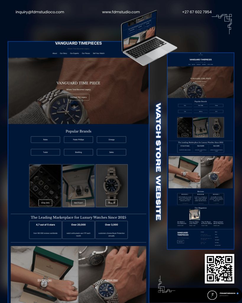 Beyond product display, the website emphasizes engagement and convenience. With features like inquiry forms, online purchases, and responsive design for mobile and desktop users, customers can explore and acquire luxury timepieces seamlessly. Vanguard Timepieces combines visual appeal, functionality, and brand prestige to create an online presence that reflects refinement and timeless sophistication.
