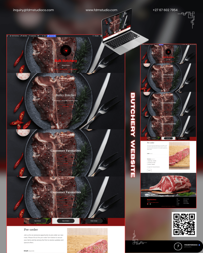 Functionality is centred around accessibility and ease of use, ensuring visitors can navigate the site effortlessly on both desktop and mobile devices. Key information is presented in a practical and organised way, supported by clear call-to-action sections that encourage inquiries and orders. Overall, the Bulk Butchery website serves as an efficient digital tool that supports sales while reinforcing reliability and product quality.